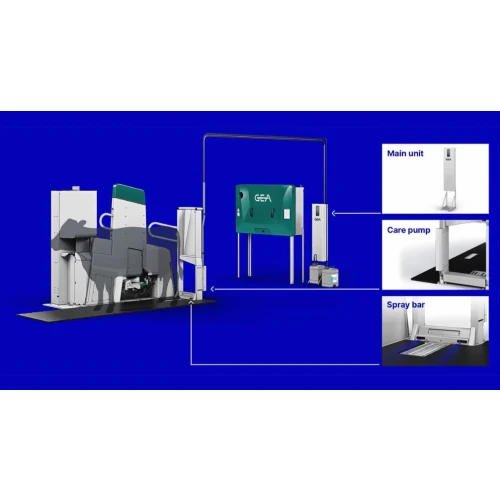 • GEA PedicoSprayer kombinerer rengjøring og kløvpleie på én gang, rett etter melking mens kua fortsatt er i DairyRobot R9500. Denne teknologien drar nytte av kraftige hygieneprodukter, som viser en effektiv løsning for å forbedre kløvpleie.